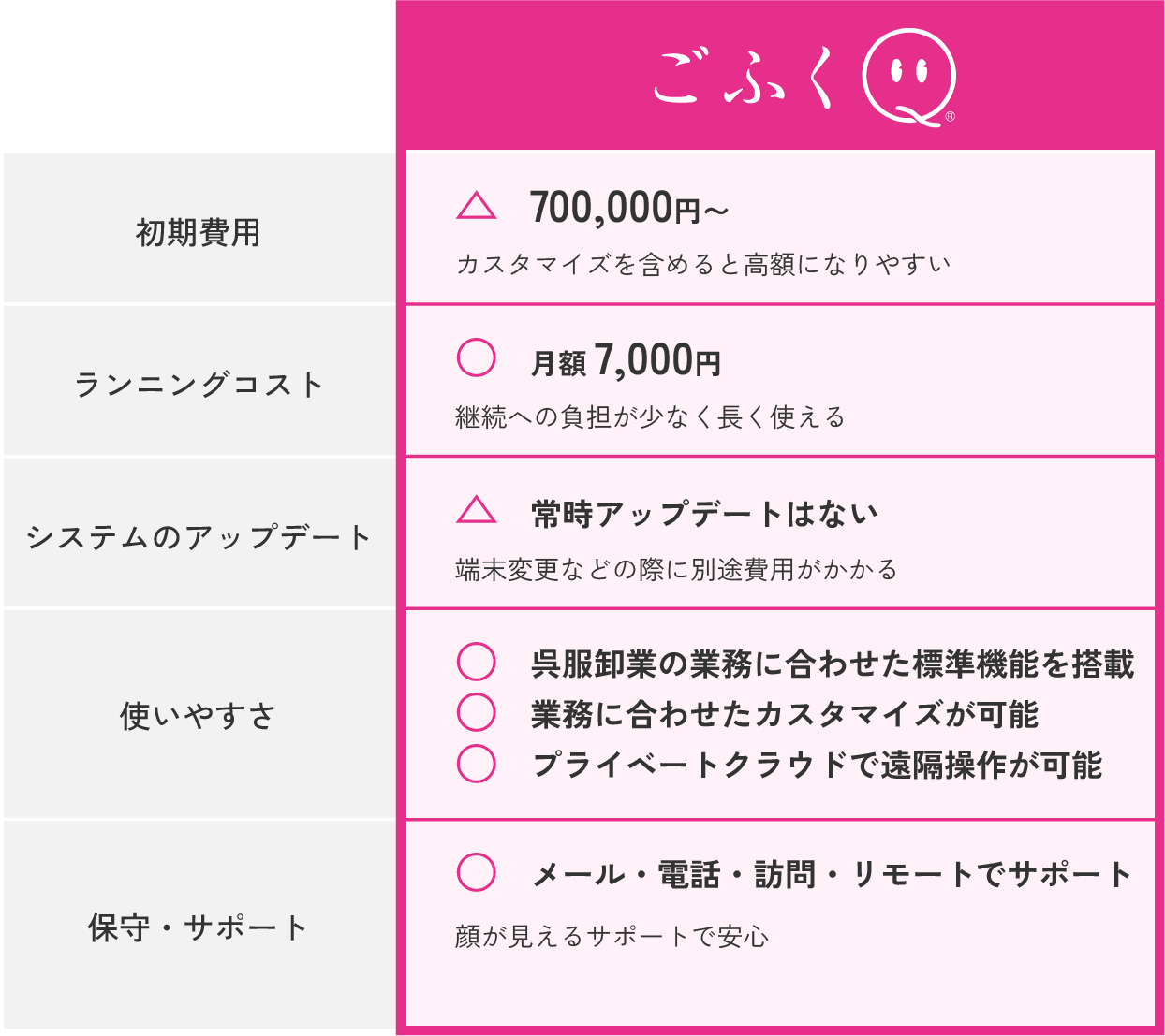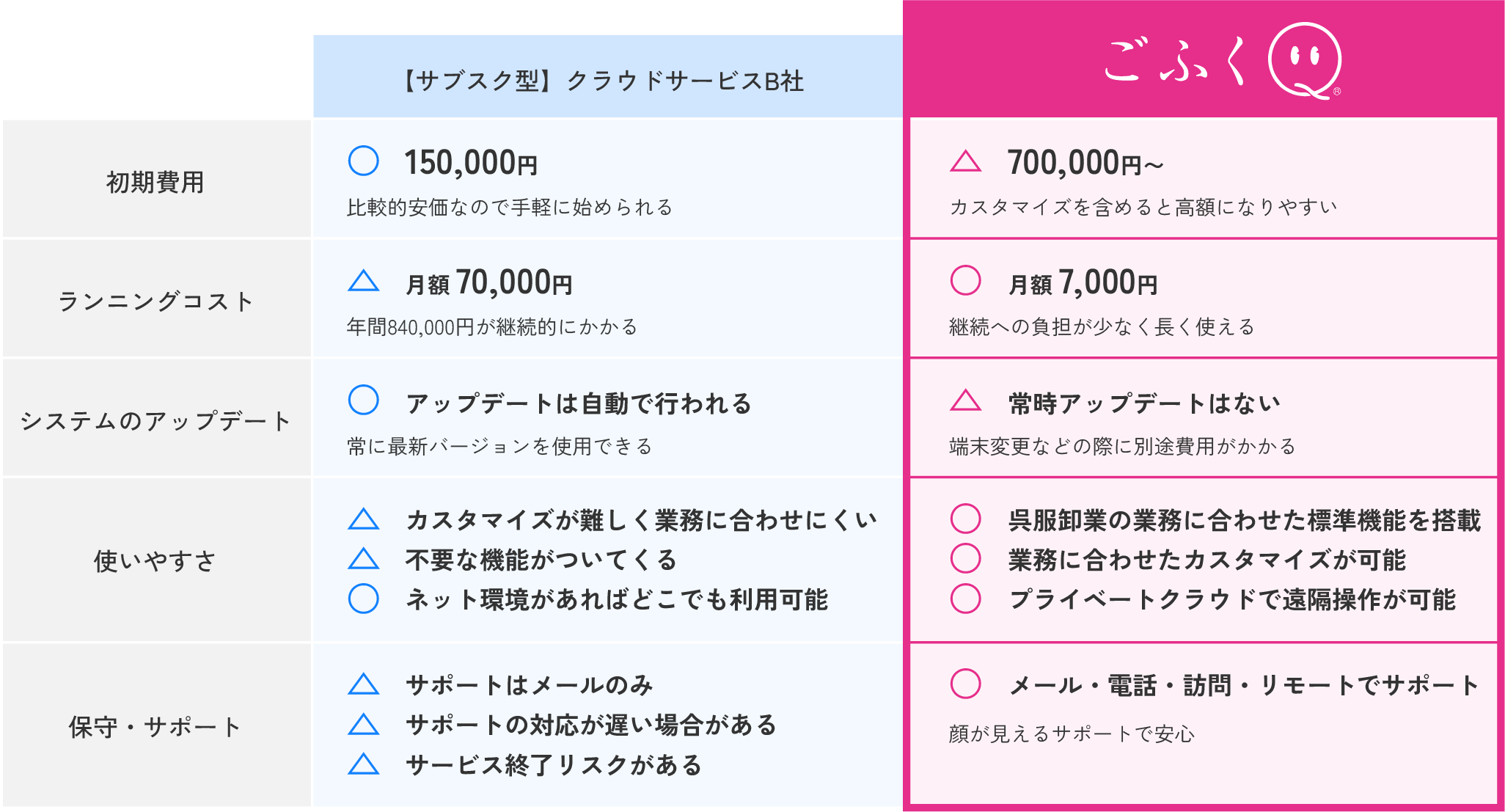 クラウド型とオンプレミス型(PCにインストールするタイプ)であるごふくQとの、それぞれのメリットとデメリットを比較しました。