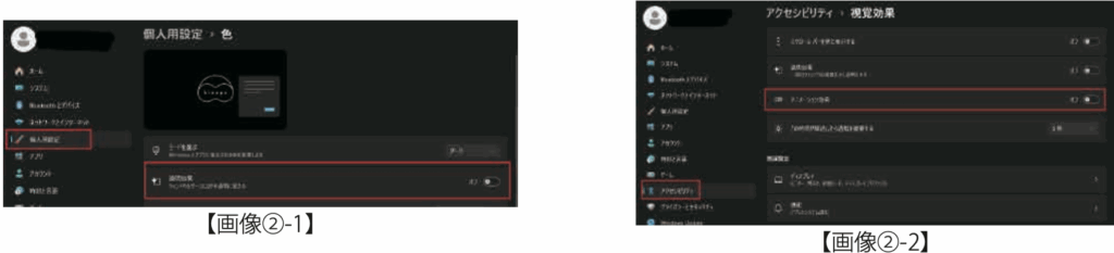 ・メリット: 見た目の美しさよりも動作の軽快さを優先することで、特に性能が高く ないPCでも反応速度が向上し、よりキビキビと作業できるようになります。 ・方法「: 設定」の個人用設定 > 色から「透明効果」をオフにし、アクセシビリティ > 視覚効果から「アニメーション効果」をオフにします。(画像2-1,2-2)