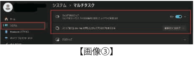 ・方法「: 設定」のシステム > マルチタスクにある「ウィンドウをスナップする」をオフにするか、細かく調整したい場合は 関連する補助機能(スナップ後に隣接アプリを表示する機能など)で調整してください。(画像3)