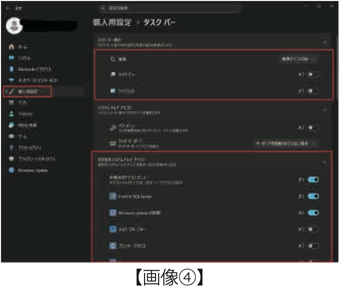 ・メリット: タスクバーが整理され、必要なアイコンだけが表示される ため、目的のアプリに素早くアクセスでき、操作ミスを防ぎます。 ・方法「: 設定」の個人用設定 >タスクバーの設定から、ウィジェットや チャット(Teams)、検索ハイライトなど、あまり使わない項目の表示 をオフにします。(画像4)