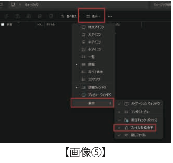 ・方法: エクスプローラーの「表示」タブ >「表示」から「ファイル名拡張子」に チェックを入れます。(画像5)